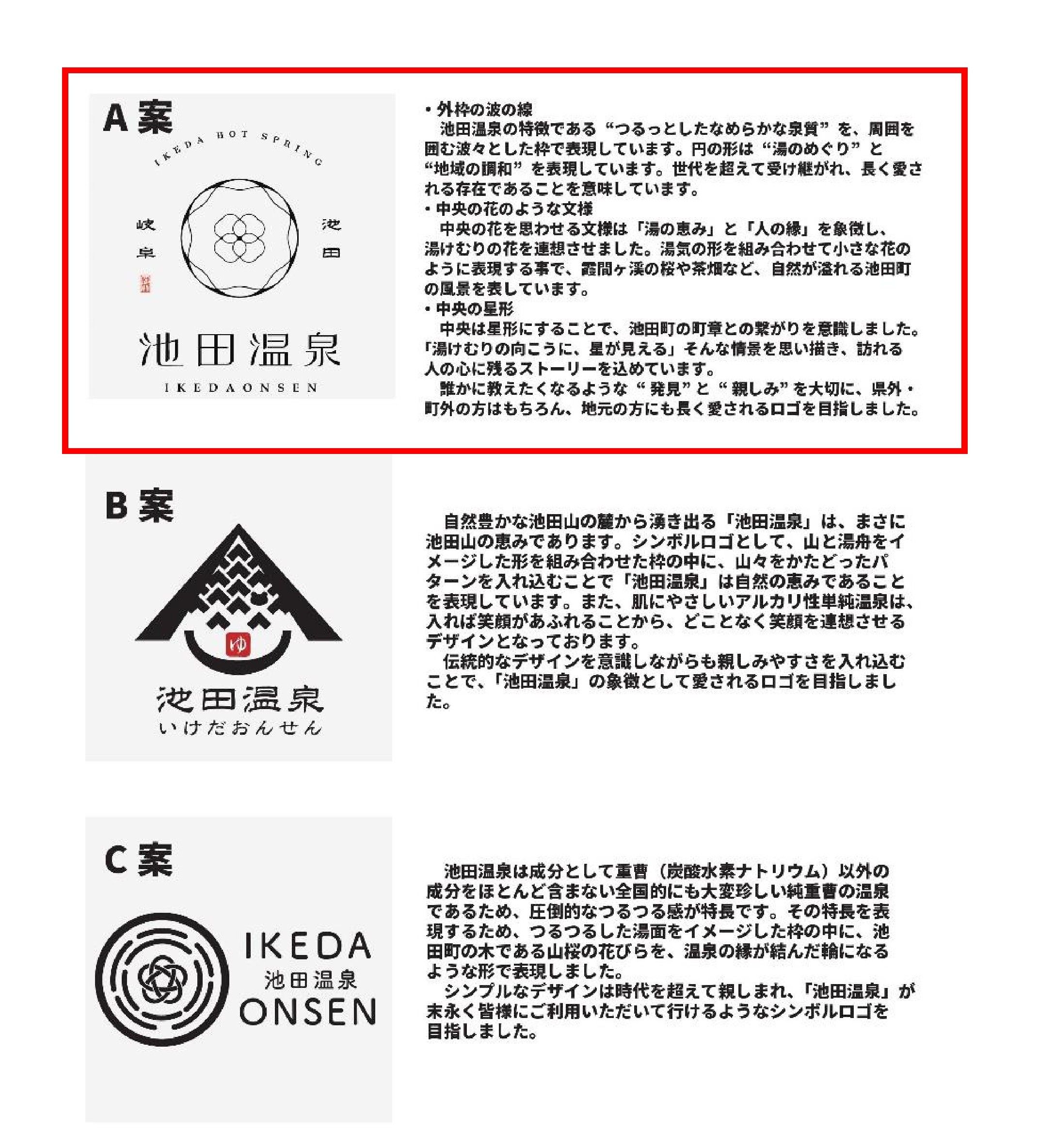 総投票数1,716票のうちA案863票、B案696票、C案157票の投票結果から池田温泉のシンボルロゴマークを『A案』に決定いたしましたのでお知らせいたします。