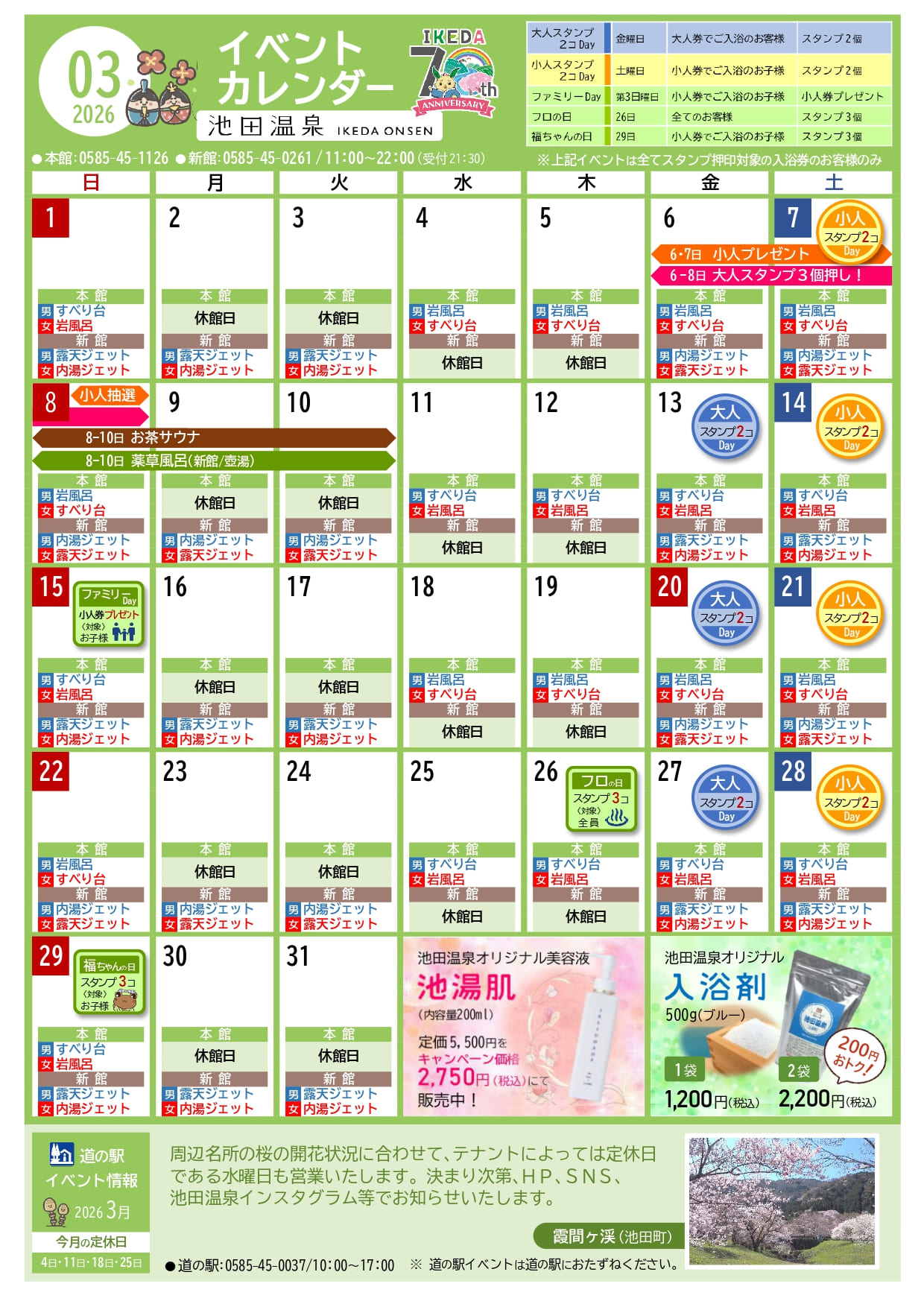 道の駅は、桜の開花状況に合わせてテナントによっては定休日である水曜日も営業いたします。詳しくはSNS等でお知らせいたします。